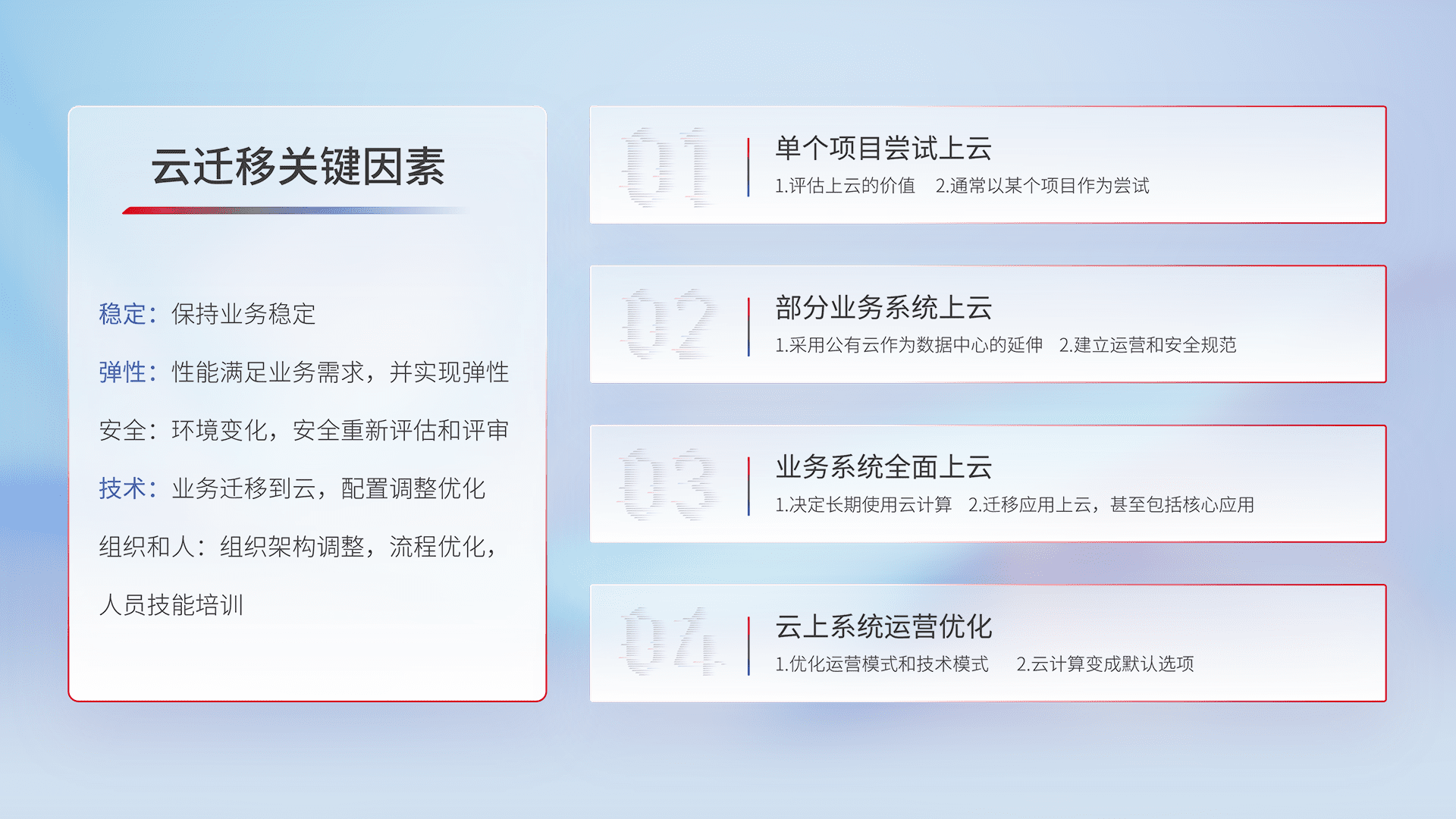 结合实际业务,,,从规划设计、、、云平台选型、、、云原生改造、、、数据迁移、、、集成交付,,迁移全过程为客户识别最佳上云路径,,,做好风险识别管理,,,设计网络架构、、身份权限、、安全审计合规、、操作审计、、、、日志审计、、、监控告警策略、、、多站点容灾设计等,,对云上基础设施进行整体规划,,,,提升IT治理水平,,以满足弹性、、、高可用、、、高性能的需求。。